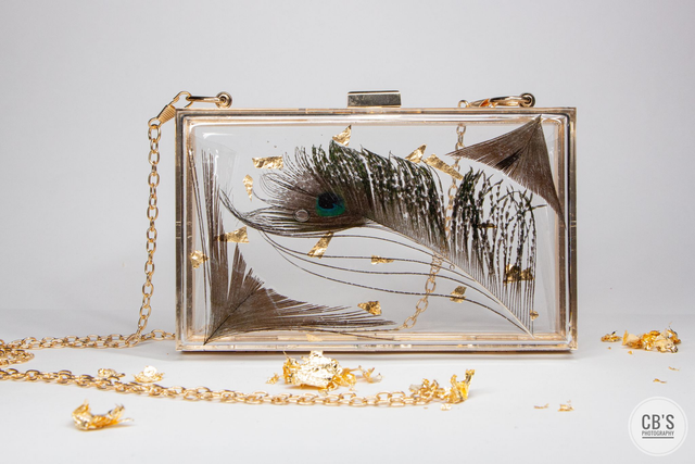 Laissez-vous séduire par l’élégance intemporelle de cette pochette unique, véritable bijou d’artisanat. Réalisée à la main, elle capture la délicatesse d’une plume de paon aux reflets irisés, suspendue dans une résine cristalline, sublimée par des éclats de feuille d’or.
