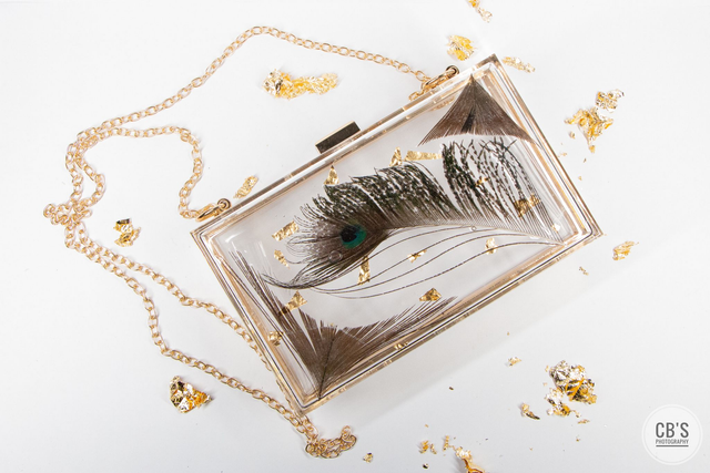 Matériaux : Résine transparente, plume de paon naturelle, feuille d’or, métal doré